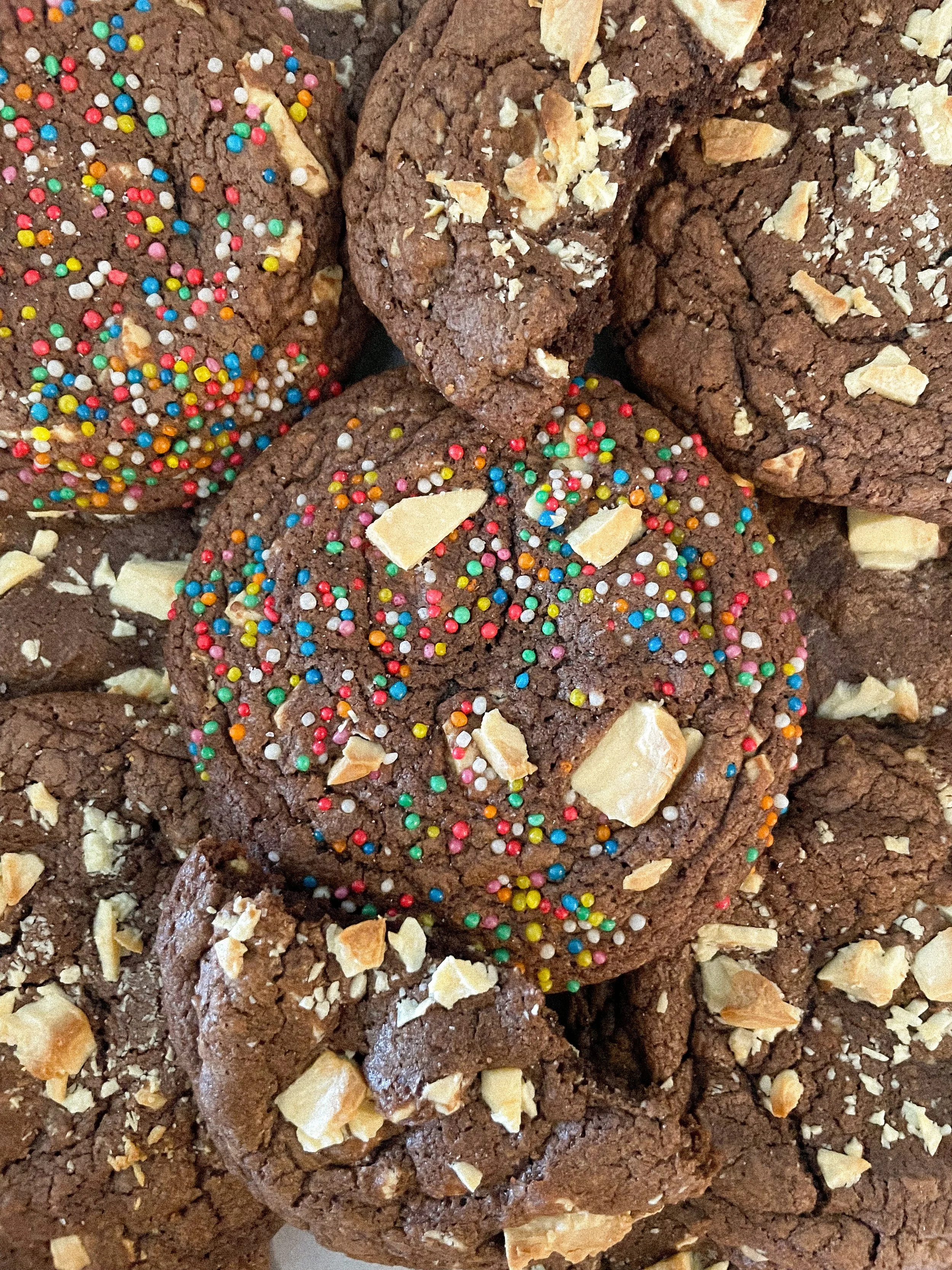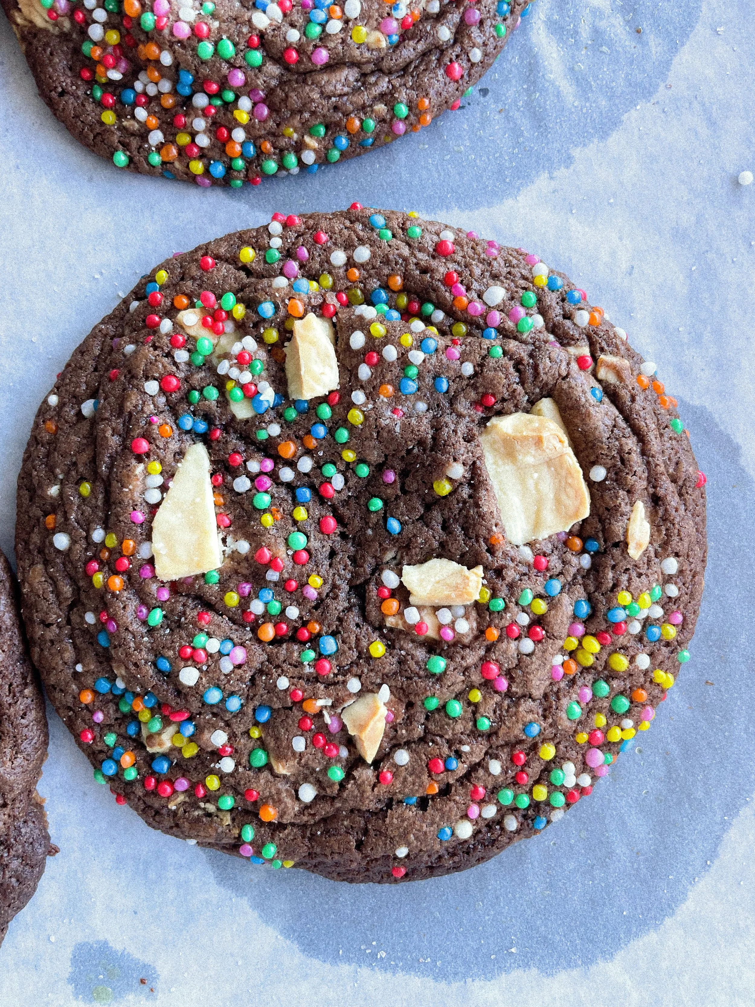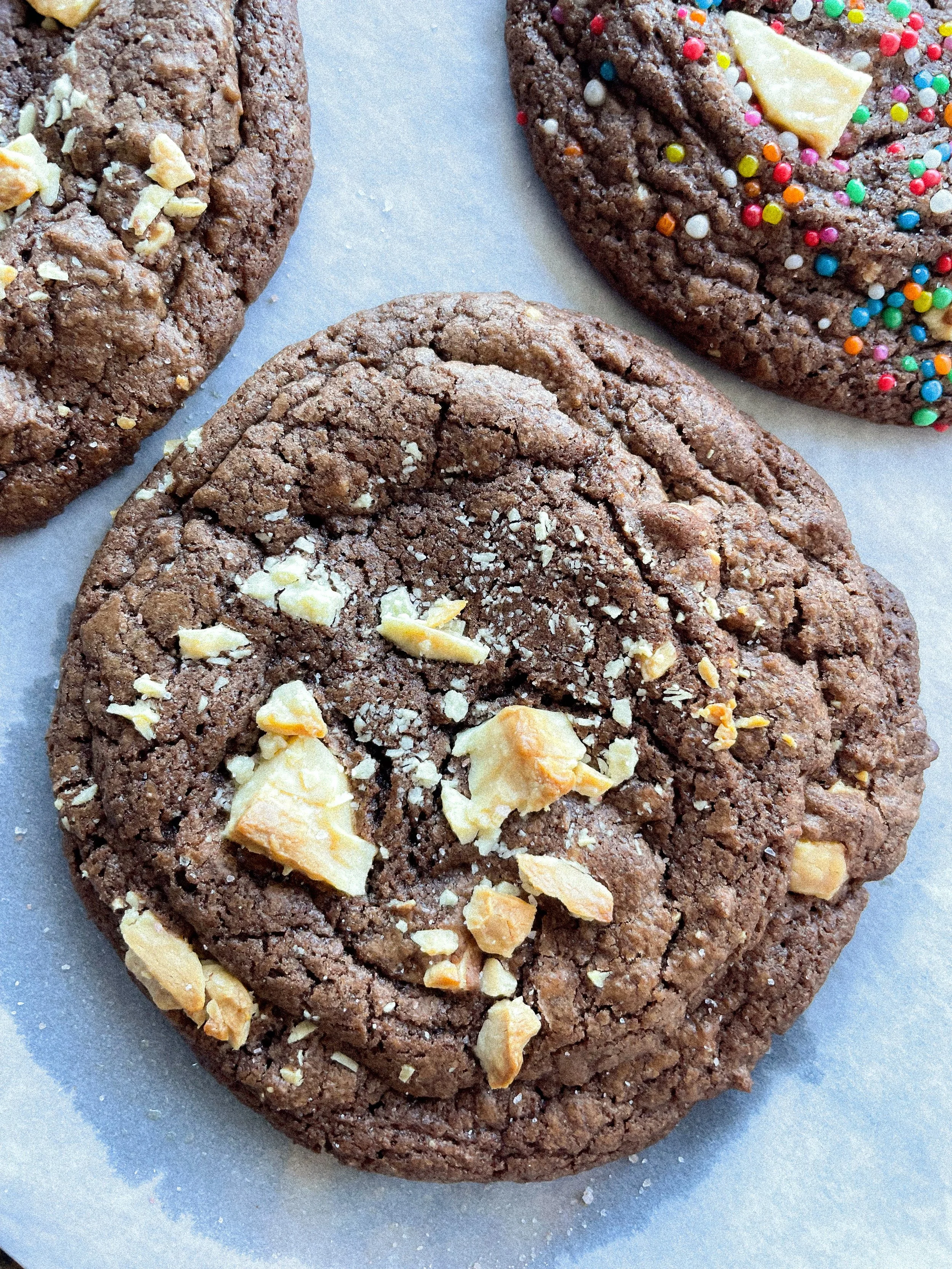 I wanted to make these cookies because of the aesthetic honestly, I loved the dark background and the pop of white. I knew that I had to add cocoa powder and that meant that the cookies were going to become dry, since cocoa powder has a drying effect that sucks the moisture from baked goods I needed to combat that, so I ended up adding a little bit of instant coffee - first for flavour, the coffee naturally enhanced the chocolate flavour - and secondly so I could add some water and bring the moisture up in the dough without adding more butter or eggs to it.