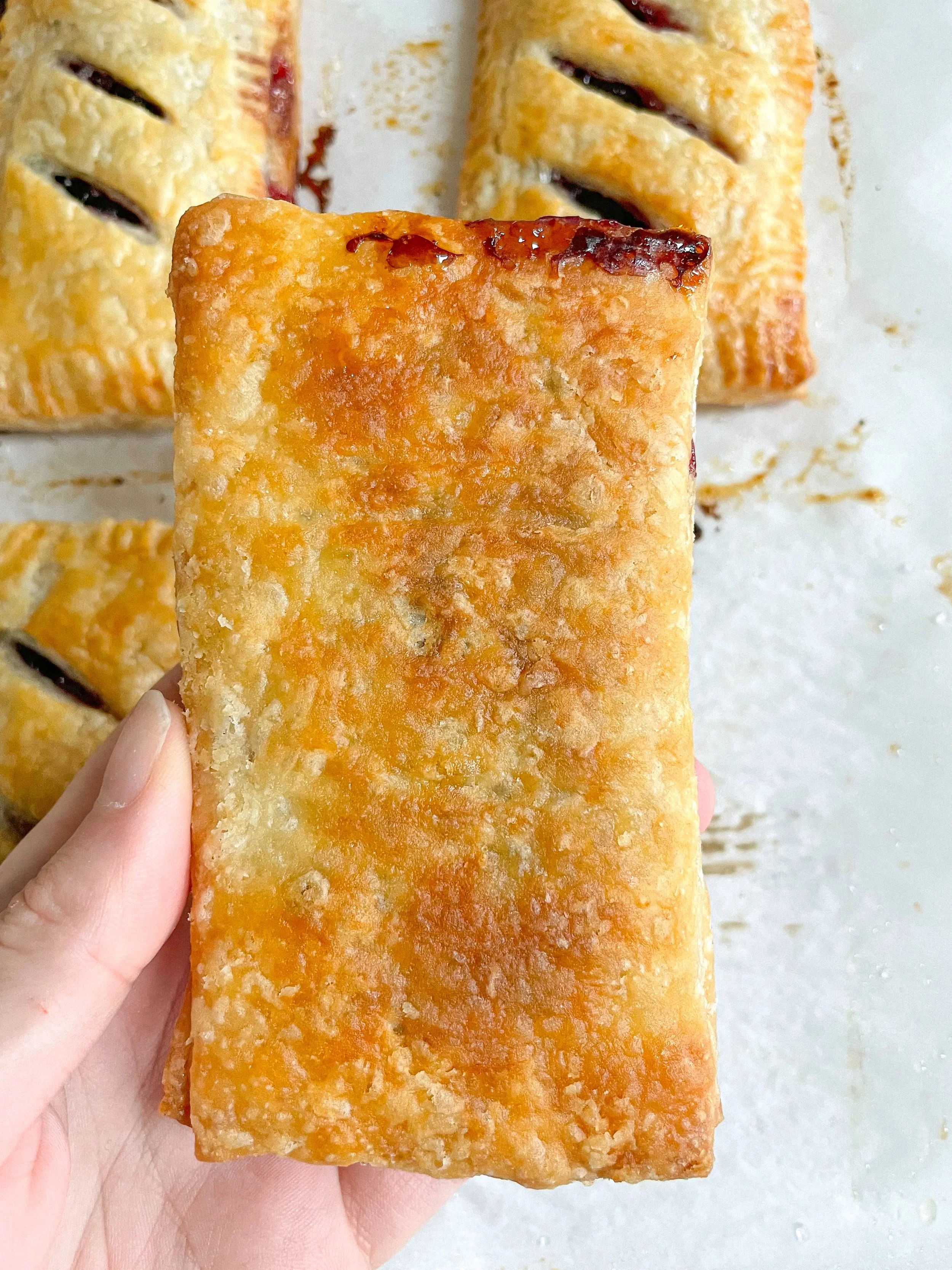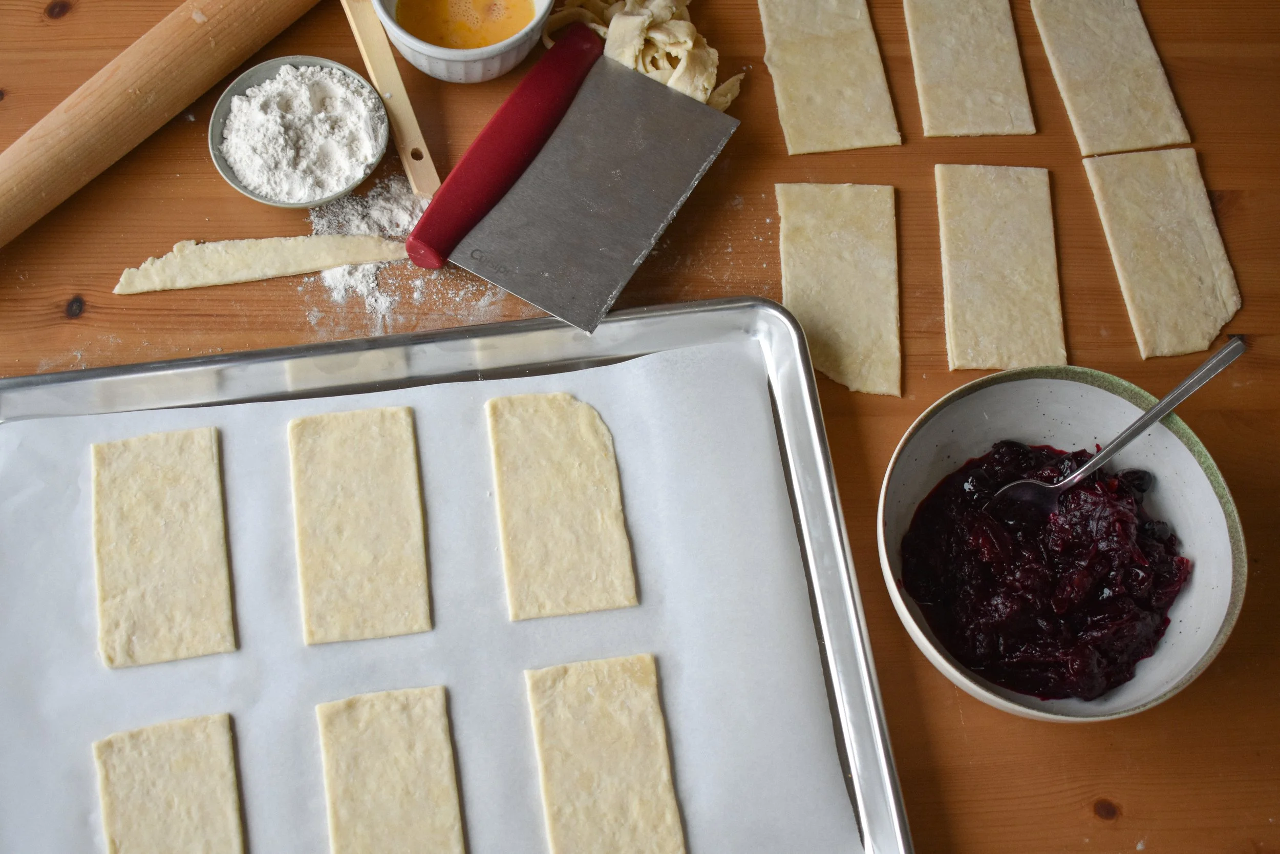 spoon 1-2tbsp of the jam into the middle of the pastry rectangles leaving a border, brush the border with egg was and place the other piece of pastry over top, crimping the edges with a fork to seal the edges, slit the top three times, repeat until you have 6 hand pies, chill for 30 minutes.