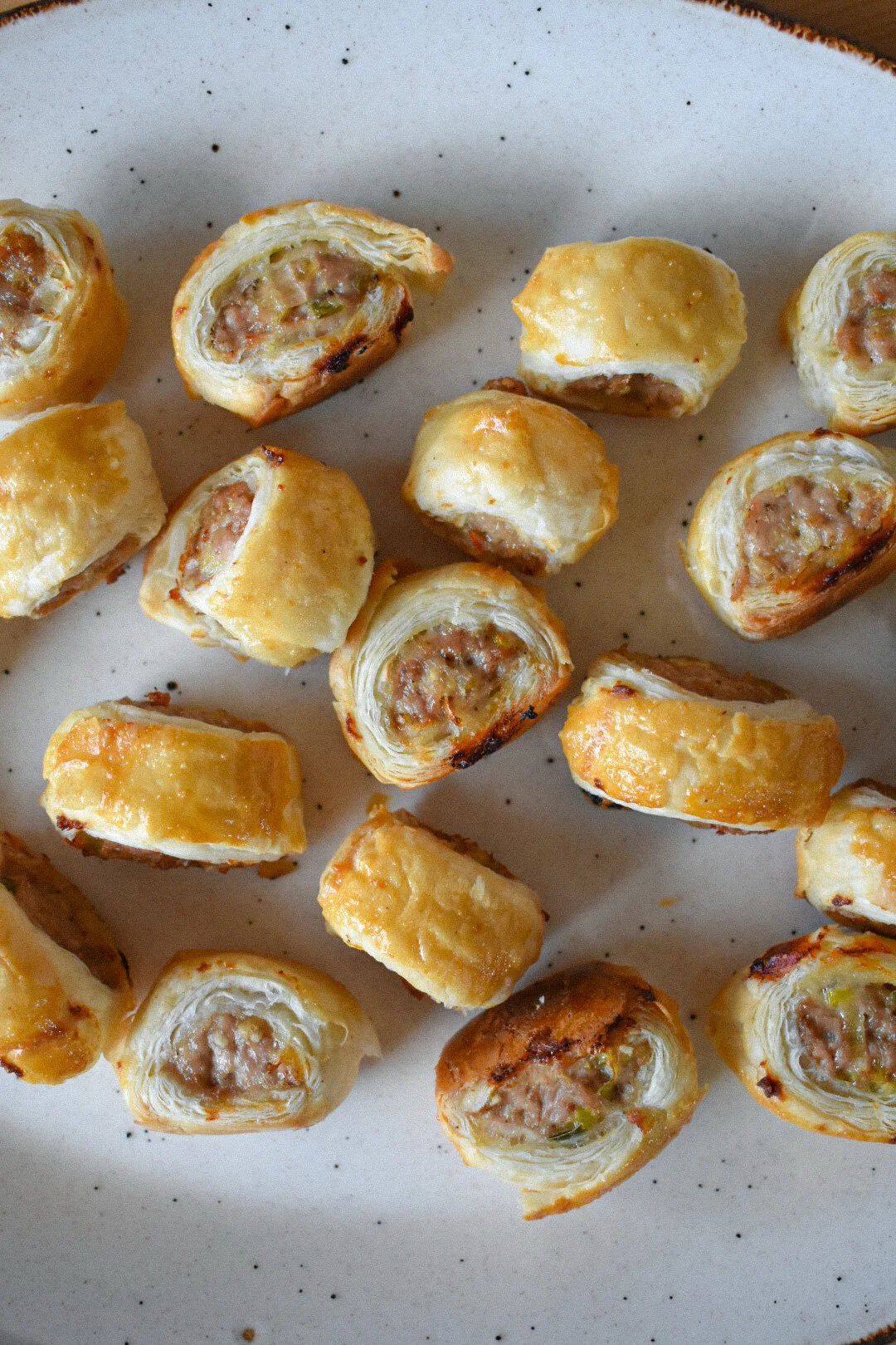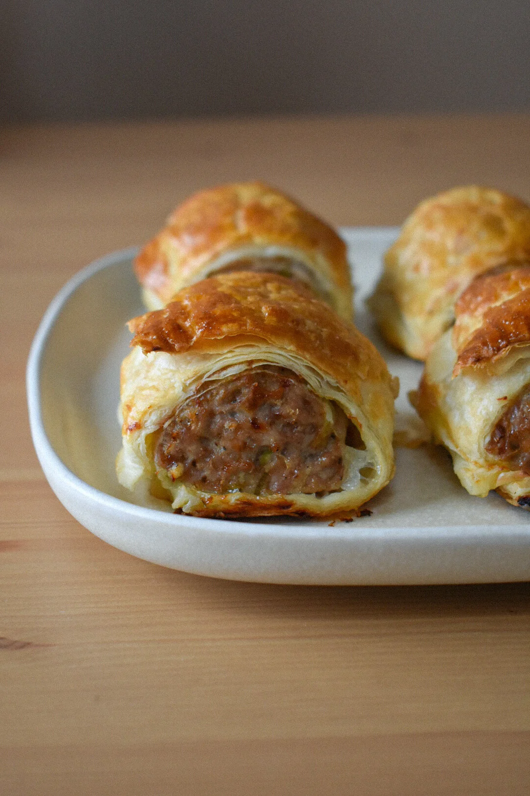 roll the pastry out to a thin rectangle, form a log with the filling along the edge of the pastry, leaving a 1cm edge brush with egg wash. roll the log over its self, to encase the filling with pastry, seal and trim the edge, repeat with the remaining pastry and filling.