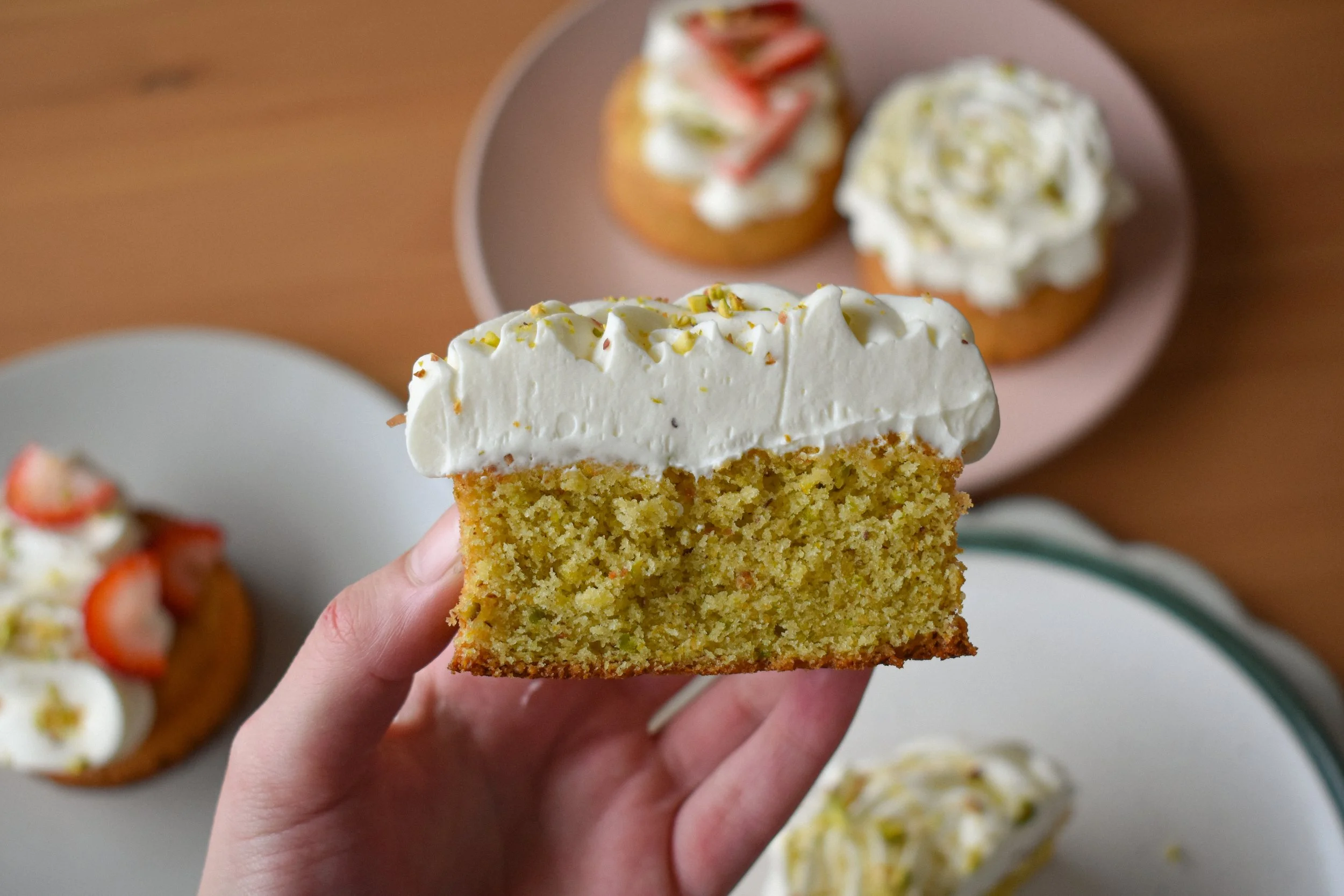 adding ground pistachios into cake batter like you would almond flour gives the cake a wayyyy more interesting flavour and provides a subtle green hue. I just buy pistachios and blend them myself in a small food processer until they become a breadcrumb-like consistency. I’m sure you could buy ground pistachios somewhere.