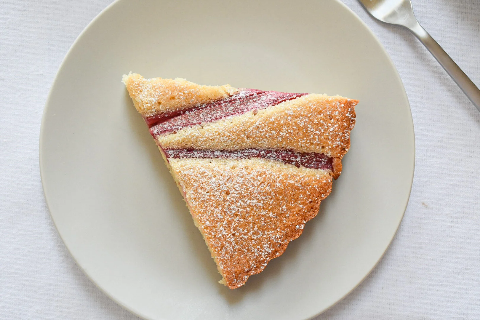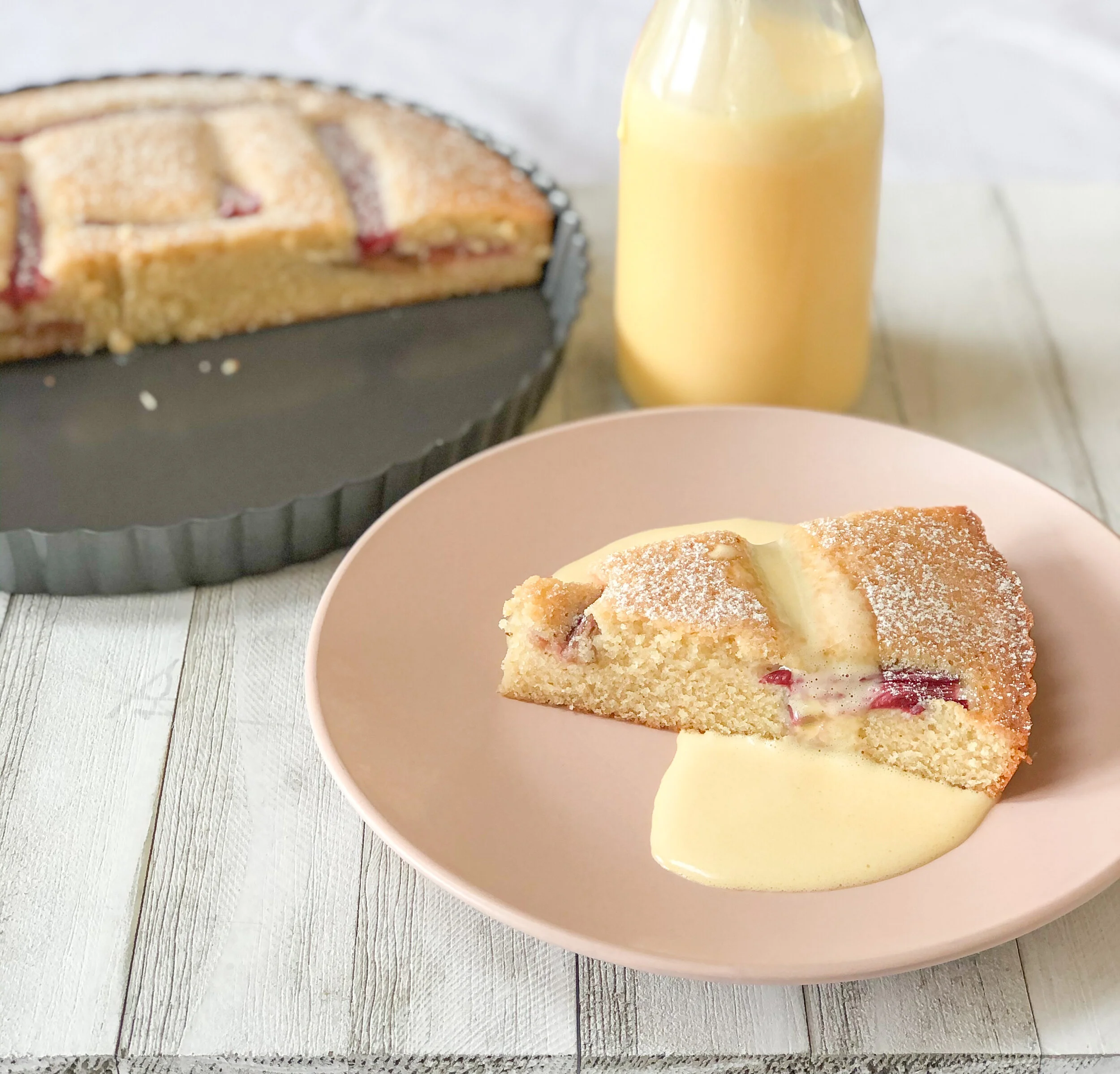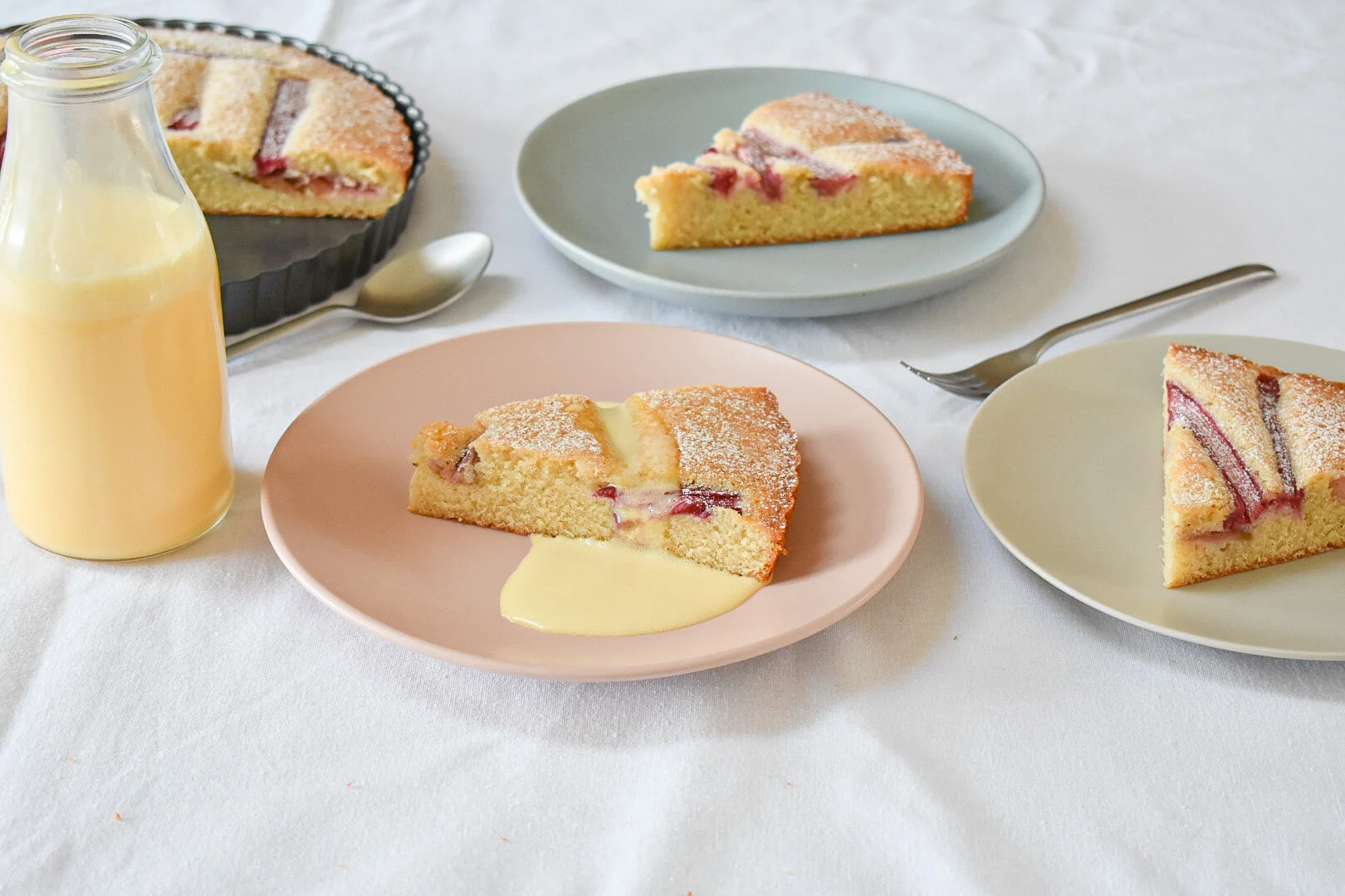 pour the batter into the greased tart tin, arrange the rhubarb on top. bake for 45 minutes, insert a toothpick for a knife if it comes out clean then the cake is done.