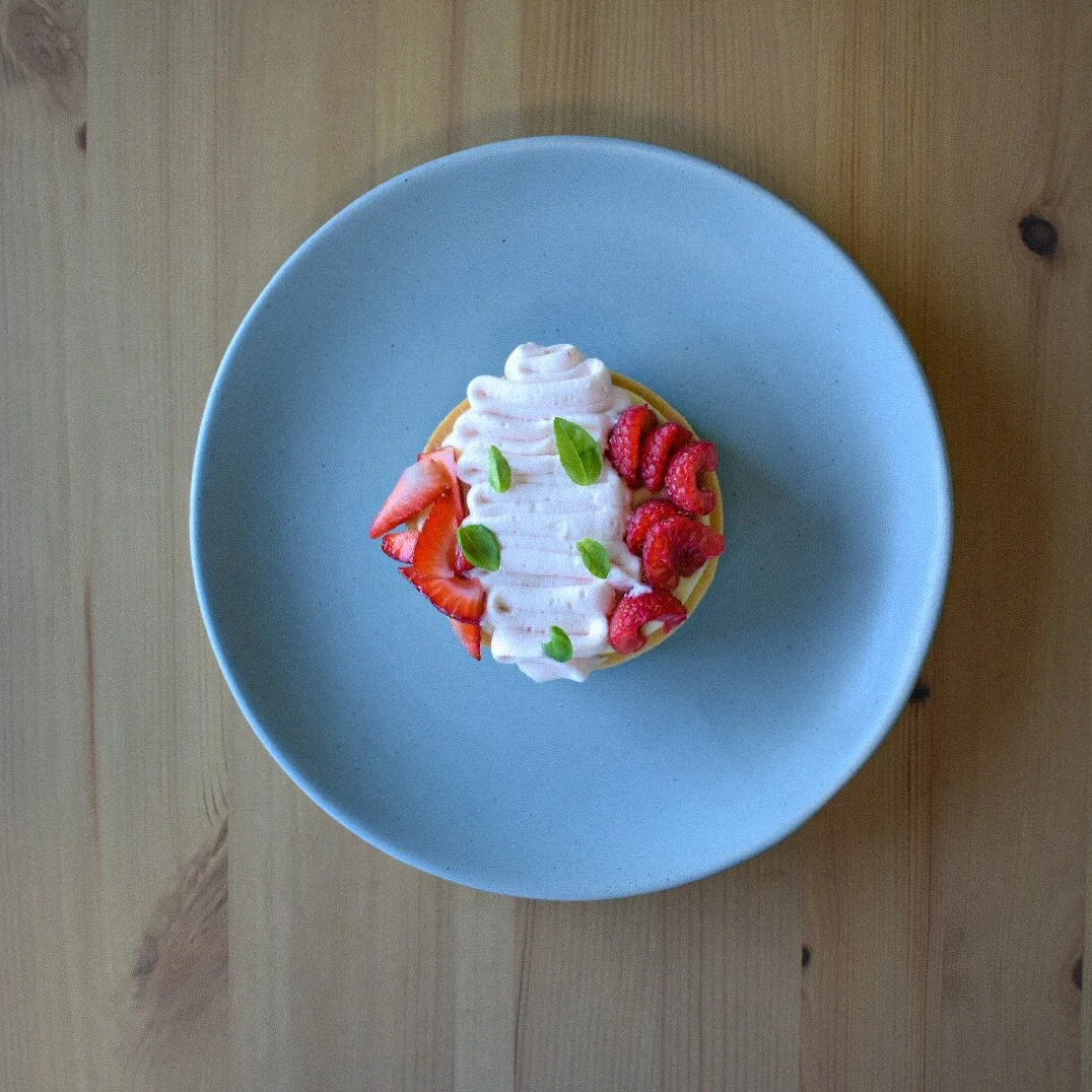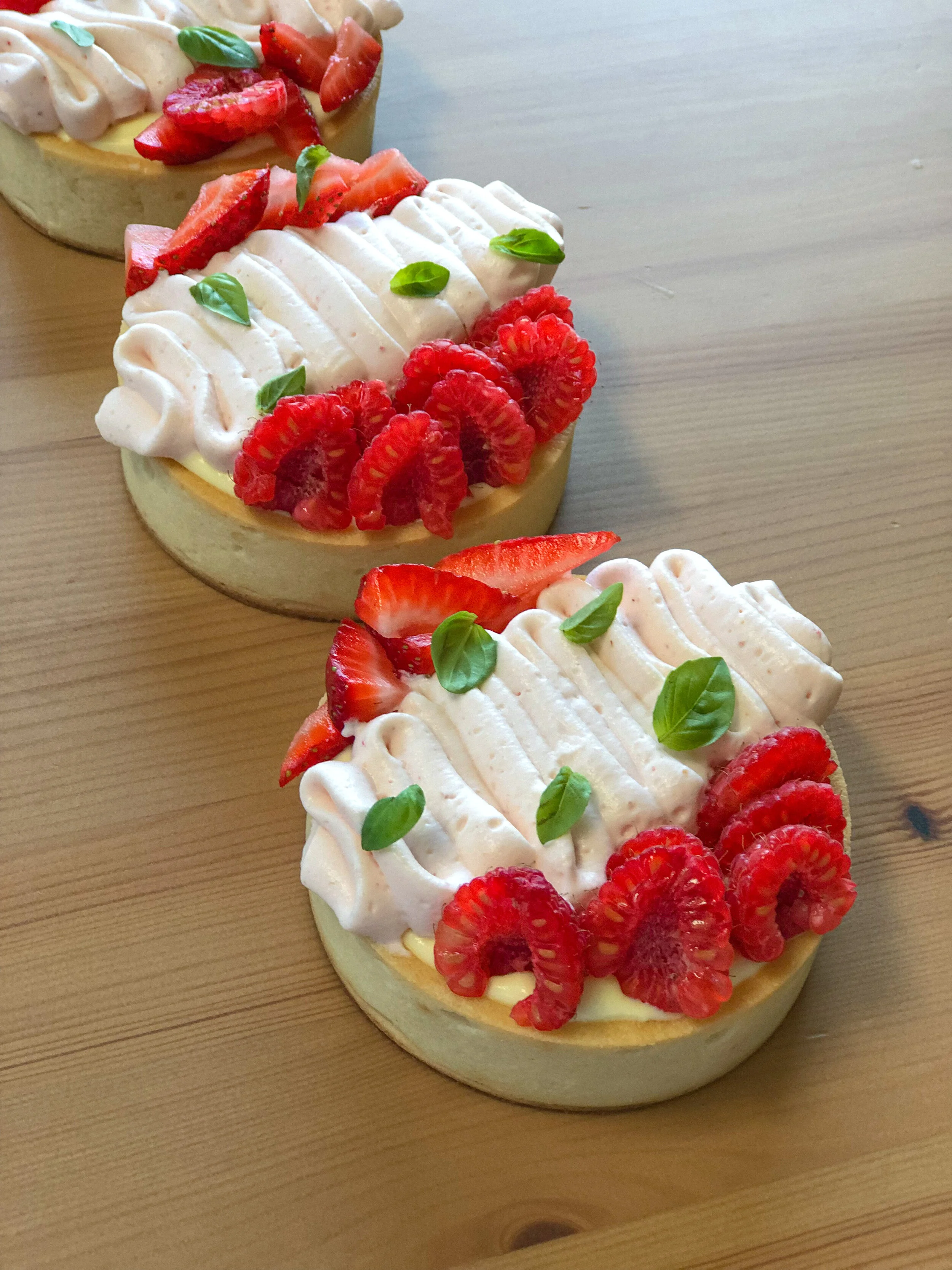 spread a spoonful of strawberry compote into the bottom of the tart case, then place the chocolate dome in the centre, pipe the diplomat cream around the dome, using an offset spatula smooth out the top of the tart, pipe the ganache on top of the tart, then just decorate with fruit:)