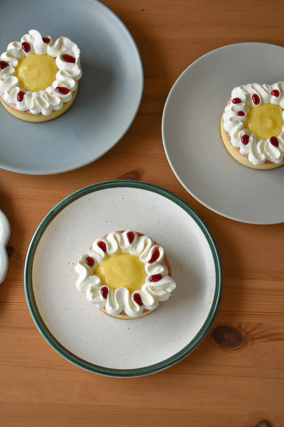whip the 200g of cream and icing sugar together until stiff peaks, transfer to a piping bag fitted with an st. Horne tip. pipe around the edges of the tart, flood the middle with lemon curd, dot with raspberry jam:)