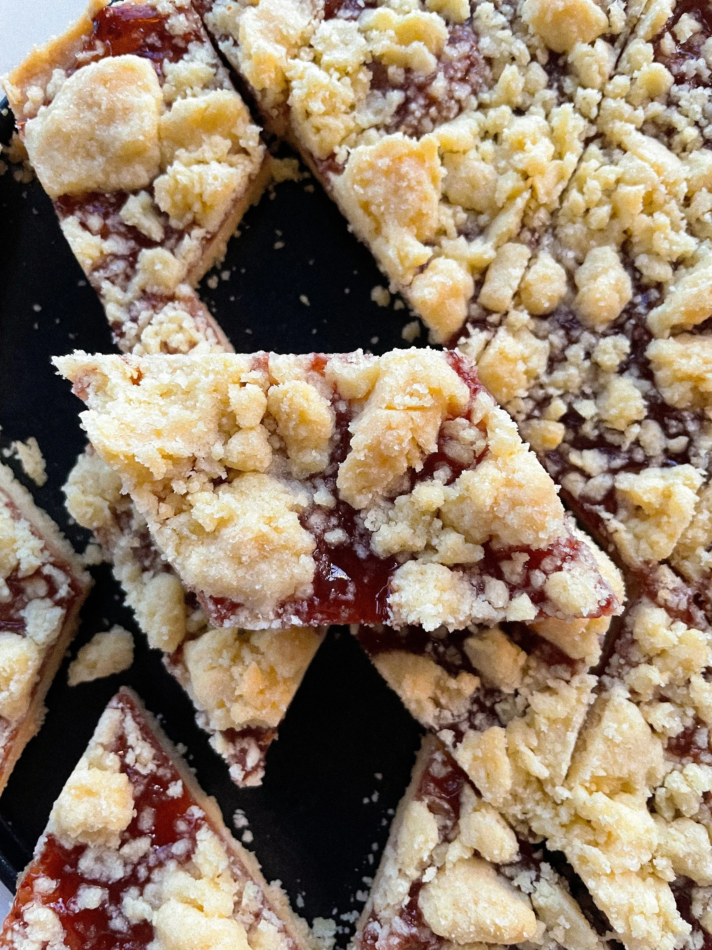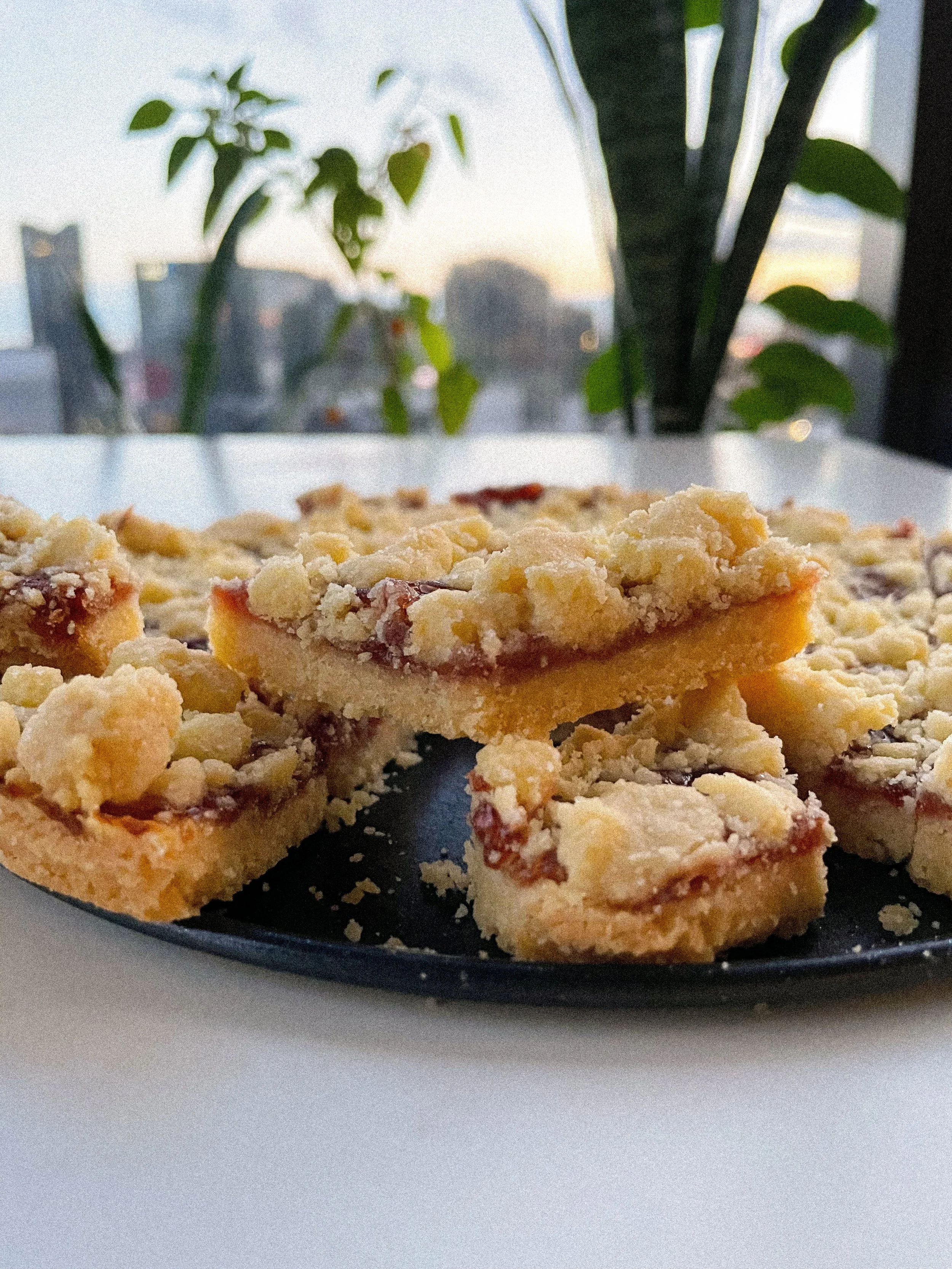 The inspiration for these came from my time as a pastry chef in a gelato shop, we made a vegan version and the offcuts were the best midmorning snacks . They’re very simple and quick to make, I used store bought jam, and my favourite shortbread recipe.
