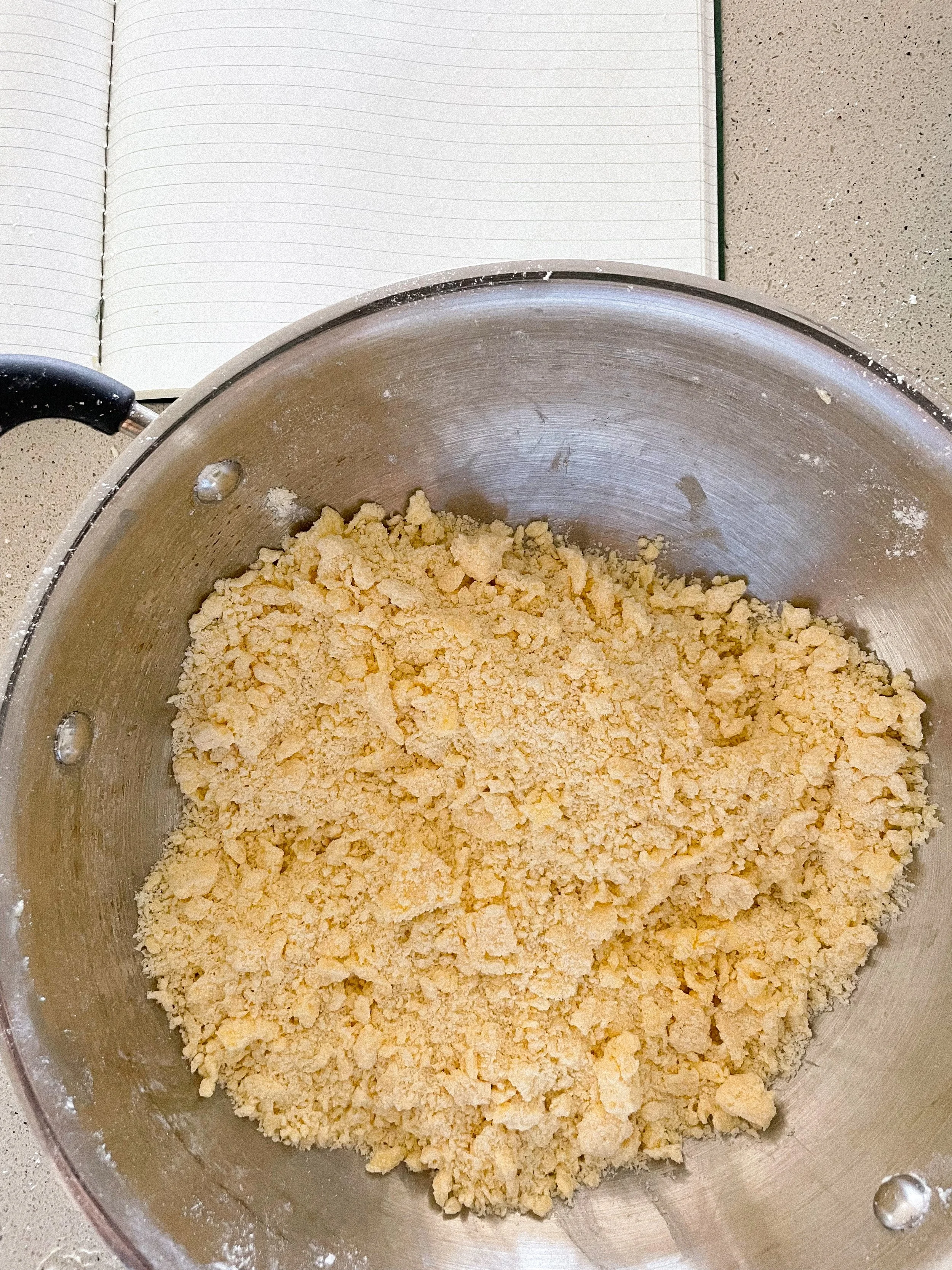 Stir together the flour and sugar in a large bowl, then add the cubed butter. Using your finger tips rub the butter into the flour to create a bread crumb mixture. This tends to take some time and makes your fingers a little tired, but it’s helping to build the structure of the shortbread.