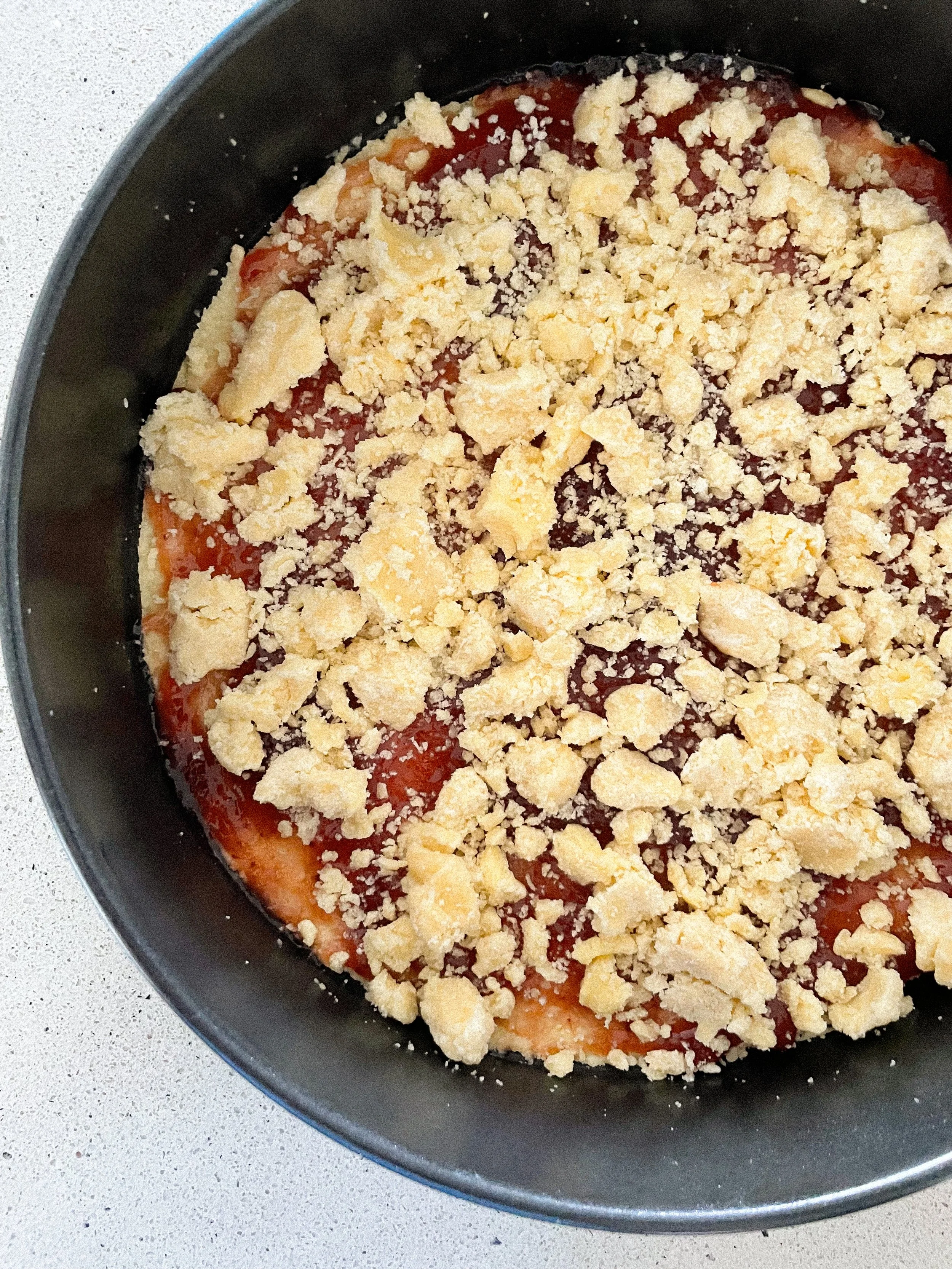 Using the dough we set aside earlier crumble it on top of the jam layer to create big and small chunks this will create the crumbly layer, try to cover the whole surface but, you still want some of the jam peaking through
