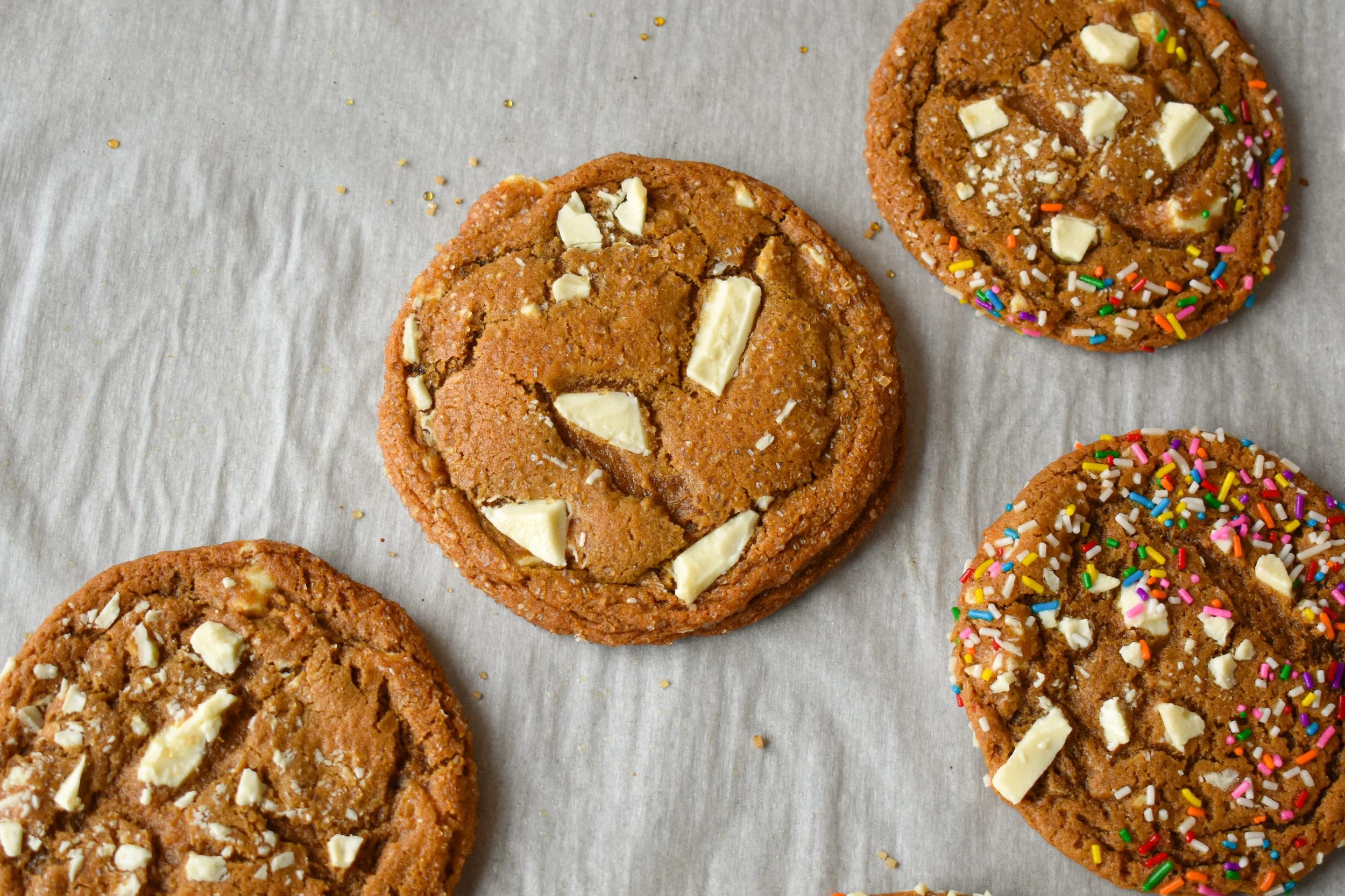 in a separate bowl, combine the flour, baking soda, spices and salt. gradually add the dry ingredients to the wet, stirring well in-between additions. once nearly all the flour has been incorporated, add the white chocolate, mix until there are no dry patches left, cover the bowl with cling film and leave in the fridge for 2 hours.